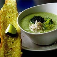 ต้มข่าครีมซุปบร็อกโคลีเสิร์ฟกับขนมปังกระเทียม