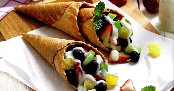 สลัดผลไม้ในกรวยแป้งโฮลวีท เมนูของหวานหน้าตาดีเพื่อสุขภาพ