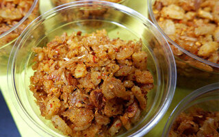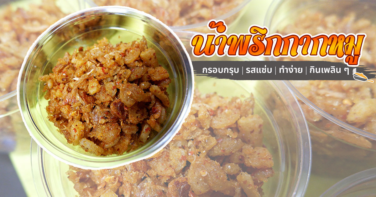 ร่างกายต้องการเพิ่มแคล ก็เลยต้องจัดเมนูน้ำพริกกากหมู สูตรอาหารไทยรสเจ็บใส่เครื่องสมุนไพรเจียวกลิ่นหอม จับคู่กับอะไรก็อร่อย แอบติดใจเมนูน้ำพริกกากหมูจากร้านดัง ครั้นจะเดินทางไปซื้ออีกก็ไกลไปหน่อย วันหยุดเลยขอลองทำเองเลยดีกว่า กระปุกดอทคอมขอนำเสนอสูตรอาหารง่าย ๆ ได้แก่วิธีทำน้ำพริกกากหมู สูตรจาก คุณแม่มณีมีของกิน สมาชิกเว็บไซต์พันทิปดอทคอม เริ่มจากเจียวกากหมูจนกรอบแล้วตำพอแตก ต่อมาก็คลุกกับหอมเจียวและกระเทียมเจียว ปรุงรสให้เผ็ดตามชอบ กินกับข้าวสวย ก๋วยเตี๋ยว ขนมจีน หรือไข่ต้มก็อร่อยเด็ดดวงไปเลยจ้าน้ำพริกกากหมูมาแล้ว ทำง่าย ไม่ยุ่งยาก ว่าแต่จะเอาไปกินคู่กับอะไรดีนะ โดย คุณแม่มณีมีของกิน สมาชิกเว็บไซต์พันทิปดอทคอม ชวนมาทำน้ำพริกกากหมู หรือจะเรียกว่ากากหมูคลุกกระเทียม หอมแดง และพริกดีกว่า เอาไว้คลุกกับข้าวเวลาไม่รู้จะกินอะไร เอาไว้ใส่กับไข่ต้ม ไข่เจียว หมูทอด โอ๊ย ! พิมพ์ไปหิวไป เอาเป็นว่าถ้าใครไม่กลัวอ้วน ไม่กลัวคอเลสเตอรอลเชิญเข้ามาได้เลยนะคะ มันหมู (หั่นเส้น) 2+1/2 กิโลกรัม หอมแดง กระเทียม น้ำตาลทราย 3 ช้อนโต๊ะ เกลือ 1 ช้อนโต๊ะ พริกป่น 1 ช้อนโต๊ะ หั่นมันหมูเป็นเส้นเตรียมไว้ นำใส่กระทะ เจียวจนเหลืองกรอบ (เราไม่ใส่น้ำ ไม่ใส่เกลือตอนเจียวนะคะ) เมื่อได้กากหมูที่เจียวไว้เรียบร้อย ก็นำมาใส่ครกตำเบา ๆ พอแตก แต่ไม่ต้องละเอียด ต่อมาก็ซอยหอมแดงและกระเทียม จากนั้นนำไปทอดจนกรอบ แล้วพักไว้รอให้เย็น ใส่หอมเจียว กระเทียมเจียวลงในกากหมู คลุกเคล้าให้เข้ากัน จากนั้นใส่น้ำตาลทรายกับเกลือ ส่วนพริกป่นลงไป (เราใช้พริกแห้งเอามาคั่วเอง แล้วปั่นค่ะ ก็เลยใส่ไปแค่ 1 ช้อนโต๊ะ เพราะเผ็ดมาก) คลุกเคล้าให้เข้ากัน ตักใส่กระปุกแช่ตู้เย็นไว้ได้เลยค่ะ อยากกินเมื่อไรก็เอาออกมาตั้งให้คลายความเย็น หรือจะตักใส่ข้าวสวยร้อน ๆ ก็ดีงาม น้ำพริกกากหมูกี่แคลก็ไม่สน เพราะส่วนตัวชอบกินอะไรก็มาหยุดไม่ได้ และยิ่งถ้าได้กากหมูชิ้นใหญ่ ๆ ด้วยแล้วยิ่งชอบมากเป็นพิเศษ บอกเลยว่าแค่กระทะเดียวไม่เกินสามวันก็หมด อ้วนก็ยอม !ขอขอบคุณข้อมูลและภาพจาก : คุณแม่มณีมีของกิน สมาชิกเว็บไซต์พันทิปดอทคอม