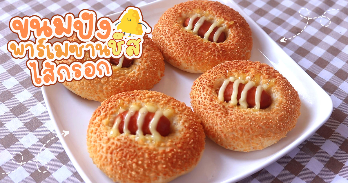 สายชีสถูกใจสิ่งนี้ ! ขนมปังพาร์เมซานชีสไส้กรอก เมนูขนมปังมีไส้ โรยชีสตูม ๆ ราดมายองเนสเพิ่มความอร่อย จากที่เคยทำขนมปังไส้กรอก เบเกอรี่รสจืด ๆ ลองโรยชีสเพิ่มความเค็มนิดหอมหน่อยกันดีไหม กระปุุกดอทคอมขอนำเสนอวิธีทำขนมปังพาร์เมซานชีสไส้กรอก จับแป้งคลุกชีสจนทั่วแล้วโปะไส้กรอกด้านบน ราดมายองเนส เสร็จแล้วเอาไปอบจนสุก แป้งขนมปัง 250 กรัม นมผง 20 กรัม น้ำตาลทราย 35 กรัม ยีสต์ 1 ช้อนชา เกลือป่น 1/2 ช้อนชา น้ำมันรำข้าว 20 กรัม น้ำ 90 มิลลิลิตร กลิ่นวานิลลา 1/2 ช้อนชา ไข่ไก่ (เบอร์ 2) จำนวน 1 ฟอง ไส้กรอก พาร์เมซานชีสขูด มายองเนส ◇ ใส่แป้งขนมปัง นมผง น้ำตาลทราย ยีสต์ เกลือป่น น้ำมันรำข้าว น้ำเปล่า และกลิ่นวานิลลา ◇ จากนั้นตีจนเนียนประมาณ 15 นาที แป้งที่ได้ที่แล้วจะขึงเป็นแผ่นฟิล์มได้ประมาณนี้ค่ะ ◇ รวบแป้งให้หน้าตึง พักแป้งประมาณ 30 นาที -1 ชั่วโมง หรือจนกว่าแป้งจะฟูขึ้นเป็น 2 เท่า ◇ พอครบเวลาชกไล่ลม นวดแป้งประมาณ 1-2 นาที พอแป้งขึ้นฟูแล้วแบ่งแป้งเป็น 8 ส่วนเท่า ๆ กัน คลึงเป็นลูกกลม ๆ พักแป้ง 10 นาที ◇ จากนั้นนำมารีดเป็นแผ่นวงกลม ◇ ทาไข่ไก่ นำมาคลุกกับพาร์เมซานชีส พักให้ขึ้นฟูประมาณ 80% ◇ พอฟูแล้ววางไส้กรอก กดลงไปตรงกลาง ราดด้วยมายองเนส ◇ นำไปอบที่อุณหภูมิ 175 องศาเซลเซียส ใช้ไฟบน-ล่าง เป็นเวลา 25-30 นาที ◇ น่ากินมากเลยจ้า ลองทำดูนะคะ วันหยุดลองมาทำขนมปังพาร์เมซานชีสไส้กรอกเป็นอาหารว่างเอาไว้แก้หิวยามบ่ายกัน ทั้งนี้จะเปลี่ยนเป็นไส้แฮม หมูหย็อง ทูน่า หรืออื่น ๆ ตามชอบเลยจ้า ◇ ขนมปังไส้กรอก สูตรโฮมเมด นวดน้อยอร่อยฟูนุ่มข้ามวัน ◇ ขนมปังไส้กรอก 2 สูตร เมนูแก้เบื่ออร่อยนุ่มสุด ๆ ทำง่ายส่วนผสมน้อย ◇ 5 สูตรขนมปังไส้กรอก เสกขนมอร่อยแป้งนุ่มซ่อนความเด้ง ◇ ขนมปังไส้กรอก หอมกรุ่นจากเตาสุดอร่อย ขอบคุณข้อมูลจาก ครัวป้ามารายห์
