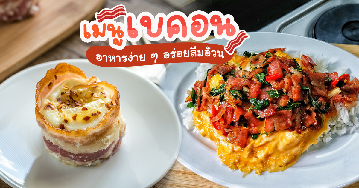 เมนูเบคอน เนรมิตเมนูอาหารจานเดียวและเมนูกับข้าวทำไม่ยาก ใครไม่กลัวอ้วนมาลองเลย เบคอน แม้ราคาแพงแต่ก็อร่อยถูกปากใครหลายคน ใครมีตุนไว้หรืออยากลองจับมาทำอาหาร วันนี้เราขอแนะนำเมนูเบคอน เช่น ข้าวผัดเบคอน ข้าวกะเพราเบคอน ไข่เจียวเบคอน ขนมปังเบคอน เป็นต้น เอาเป็นว่าถ้าสนใจมาเข้าครัวกัน เบคอนทำจากเนื้อหมูสามชั้นส่วนท้อง ส่วนสันใน หรือส่วนคาง หรืออาจมีการประยุกต์ใช้เนื้อสัตว์ชนิดอื่นก็ได้เช่นกัน เช่น เบคอนเนื้อ เบคอนไก่ เป็นต้น โดยกรรมวิธีการทำต้องนำเนื้อหมูหมักกับเกลือและส่วนผสมอื่น ๆ จนได้ที่แล้วเอาไปรมควันและแช่เย็น เบคอนทำอาหารได้หลากหลายเมนูทั้งอาหารไทยและอาหารต่างประเทศ มีทั้งเมนูอาหารจานเดียว เมนูกับข้าว อาหารว่าง และโรยหน้า เช่น ข้าวผัดเบคอน ไข่เจียวเบคอน ผัดกะเพราเบคอน สปาเกตตีเบคอน ขนมปังไส้เบคอน มันอบเบคอน เป็นต้น ใครแอบอยากทำเมนูเบคอนเข้ามาจดสูตรกัน โดยเฉพาะข้าวผัดเบคอน อาหารจานเดียวอิ่มท้อง หรือจะทำเบคอนห่อชีสเหมาะเป็นอาหารว่างก็ได้นะ ★ 11 เมนูห่อเบคอน อาหารฝรั่งกินอร่อยจนพุงกาง ★ 8 เมนูเบคอน อาหารฝรั่งโดนใจใครไม่กลัวอ้วนเชิญทีมพี่ ★ มาอ้วนกัน ! 19 เมนูชีสและเบคอน ความอร่อยเน้น ๆ น้ำหนักไม่เกี่ยว ★ ขนมปังพันเบคอน ไส้เชดดาร์ชีสเยิ้ม ๆ เมนูชีสและเบคอนเย้ายวนเกินห้ามใจ