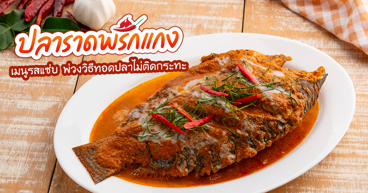 ปลาราดพริกแกง เมนูกับข้าวรสเผ็ด อร่อยกับเนื้อปลานุ่ม ๆ คลุกกับข้าวสวย พร้อมเคล็ดลับทอดปลาให้อร่อย ไม่คาว ไม่ติดกระทะ เมนูปลาทอดกับน้ำจิ้มซีฟู้ด หรือเมนูปลาราดพริกสามรส อาหารไทยแม้จะรสแซ่บแต่กินบ่อยก็เบื่อ ลองมาทำเมนูปลาราดพริกแกงกันไหม แค่ราดพริกแกงลงไปทั่วตัวปลาทอด บอกเลยรสชาติเผ็ดเข้มข้น แถมไม่ต้องกลัวปลาทอดติดกระทะเพราะมีเคล็ดลับเด็ดมาบอกกันด้วย น้ำพริกแกงเผ็ด หรือน้ำพริกแกงแดง เป็นน้ำพริกแกงของไทย นิยมนำมาประกอบอาหารให้มีรสเผ็ดและสีสันสวยงาม โดยส่วนผสมมีหลายอย่าง เช่น พริกแดง หอมแดง กระเทียม กะปิ เกลือ ข่า ตะไคร้ ผิวมะกรูด เป็นต้น นำมาโขลกหรือปั่นจนละเอียด น้ำพริกแกงเผ็ดทำเมนูอาหารไทยได้หลายอย่าง ไม่ว่าจะเป็นเมนูแกงไทย เช่น แกงเผ็ดเป็ดย่าง แกงเผ็ดไก่ แกงเนื้อหน่อไม้ เป็นต้น เมนูผัดพริกแกง เช่น ปลาดุกผัดพริกแกง เนื้อผัดพริกแกง กุ้งผัดพริกแกง หมูผัดพริกขิง เป็นต้น เมนูราดพริกแกง เช่น ปลาราดพริกแกง หรือเมนูประยุกต์ เช่น ไข่เจียวพริกแกง เป็นต้น ถ้าต้องการทอดปลาไม่ติดกระทะให้ใส่เกลือคั่วพอให้เกลือแห้งและเปลี่ยนเป็นสีเหลือง หรือใส่น้ำส้มสายชูลงไปในกระทะ เปิดไฟ รอให้ระเหยแล้วค่อยใส่น้ำมันลงไป หรือทาแป้งทอดกรอบเคลือบตัวปลาบาง ๆ ก่อนนำลงไปทอด ขณะทอดไม่ควรพลิกปลากลับไปกลับมาบ่อย ๆ เพราะจะทำให้เนื้อปลาเละ ควรทอดทีละด้านจนสุก หรือเสียงน้ำมันดังเบาลง จึงค่อยพลิกกลับอีกด้านหนึ่ง ถ้าไม่ต้องการให้ปลาทอดมีกลิ่นคาวควรล้างด้วยเกลือและหมักด้วยเกลือ ทั้งนี้ สามารถหมักด้วยน้ำปลาแทนได้เช่นกัน หรือถ้าต้องการหมักให้มีความหอมขึ้นมาหน่อยสามารถใส่กระเทียมกับพริกไทยเพิ่มได้ และอาจปรุงรสด้วยซอสปรุงรสและน้ำมันหอยเพิ่มเติมได้เช่นกัน ถ้าต้องการให้ปลาทอดมีความกรอบควรคลุกด้วยแป้งสาลีจนทั่วก่อนทอด เพื่อให้หนังปลากรอบไม่เหี่ยว และควรบั้งด้วยเพื่อให้สุกง่ายขึ้น ถ้าไม่ต้องการทอดทั้งตัวสามารถหั่นชิ้นทอดได้เช่นกัน ปลานิลทอด 1 ตัว พริกชี้ฟ้าแดงซอยเป็นเส้นยาว พริกแกงเผ็ด 2 ช้อนโต๊ะ น้ำตาลปี๊บ น้ำปลา เกลือ น้ำมันพืช ใบมะกรูดซอย ตั้งกระทะใส่น้ำมันเล็กน้อย ใส่พริกแกงเผ็ดลงไปผัดจนหอม ปรุงรสด้วยน้ำตาลมะพร้าว น้ำปลา เกลือ ผัดจนน้ำตาลละลาย ใส่พริกชี้ฟ้า ผัดจนเข้ากัน ตักราดบนปลาทอด โรยใบมะกรูด ใครกำลังมองหาเมนูอาหารเย็น ลองทำปลาราดพริกแกงกัน จะทอดปลาเองหรือจะซื้อปลาทอดมาใช้เลยก็ได้ ทีเด็ดคือราดพริกแกงฉ่ำ ๆ เลยจ้า 7 ปลาทอดแบบแซ่บ ทั้งกับข้าวและกับแกล้มพ่วงเคล็ดลับทอดปลาให้อร่อย 5 เมนู