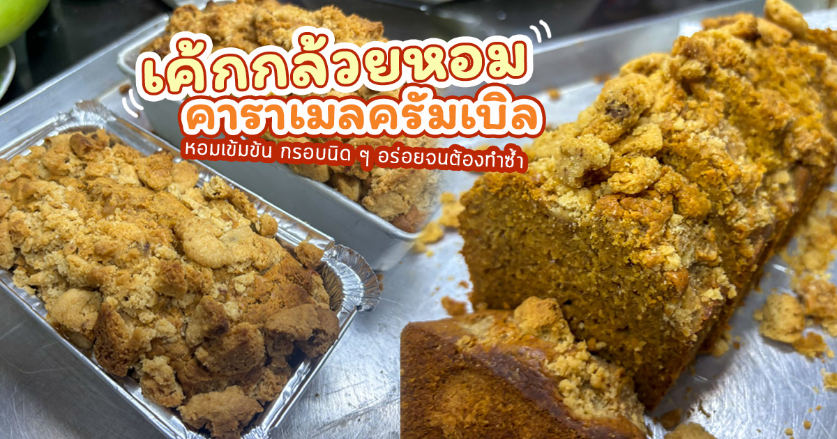 สูตรเค้กกล้วยหอมคาราเมลครัมเบิล หอมเข้มข้นด้วยบราวน์บัตเตอร์และคาราเมลกล้วย มีครัมเบิลน้ำตาลทรายแดงโรยหน้า กรอบนิด ๆ อร่อยเกินคาด พร้อมขั้นตอนละเอียด ทำตามได้เลย ใครที่บ้านมีกล้วยหอมสุกเยอะจนไม่รู้จะทำอะไรดี บอกเลยว่านี่คือโอกาสทองที่จะเปิดเตาอบ เพราะ เค้กกล้วยหอม คือหนึ่งในเมนูเค้กแสนอร่อยที่กินได้ทุกวัน ไม่มีเบื่อ แถมยังเป็นของฝากที่ใครได้รับก็ยิ้มได้ทุกครั้ง แต่ถ้าอยากอัปเกรดจากเค้กกล้วยหอมธรรมดาให้เป็นอะไรที่ "ว้าว" กว่าเดิม วันนี้เราเอาสูตรเด็ดมาฝากกัน โดยสูตรนี้ได้รับการแบ่งปันจาก คุณ fillerneck สมาชิกเว็บไซต์พันทิปดอทคอม จุดเด่นของสูตรนี้คือ เนื้อเค้กเข้มข้นแบบเค้กเนยสด หอมกลิ่น Brown Butter และคาราเมลกล้วย แถมยังมีครัมเบิล (Crumble) น้ำตาลทรายแดงโรยหน้า ให้ความกรุบกรอบและรสหวานละมุนที่ลงตัวมาก ๆ ใครชอบสูตรขนมที่มีดีเทลและรสชาติจริงจัง ห้ามพลาดเลย !ส่วนที่ 1 ครัมเบิล (Crumble) น้ำตาลทรายขาว 10 กรัม น้ำตาลทรายแดง 40 กรัม เนย 50 กรัม แป้ง 60 กรัม ส่วนที่ 2 ตัวเค้ก ส่วนแห้ง แป้ง 270 กรัม เบกกิ้งโซดา ½ ช้อนชา (ไม่ใช้ผงฟู) เกลือ ½ ช้อนชา ส่วนเปียก นมสด 180 มล. ไข่ไก่ 3 ฟอง เนยละลาย 100 กรัม ส่วนที่ 3 คาราเมลกล้วย น้ำตาลทรายขาว 100 กรัม เนย 45 กรัม วิปปิ้งครีม 60 กรัม กล้วยหอม 3 ลูก เกลือ หยิบมือ 1. ขั้นตอนที่ 1 ทำครัมเบิล เริ่มต้นด้วยการผสมน้ำตาลทรายขาว น้ำตาลทรายแดง เนย และแป้งเข้าด้วยกันจนเป็นเนื้อร่วน ๆ แบบที่คนทำขนมเรียกว่า ครัมเบิล หรือก็คือหน้าตาคล้ายคุกกี้แตก ๆ นั่นเอง จากนั้นนำเข้าอบที่ 180 องศา นาน 15 นาที พอสีสวยแล้วเอาออกมาพักให้เย็น แล้วหักเป็นชิ้นหยาบ ๆ เตรียมไว้โรยหน้าเค้ก 2. ขั้นตอนที่ 2 ทำคาราเมลกล้วย Brown Butter หัวใจของสูตรนี้ ! เริ่มด้วยการตั้งน้ำตาลทรายขาวในกระทะจนได้สีน้ำตาลสวย จากนั้นใส่เนยลงไปเลย เคี่ยวต่อจนเนยแตกตัวกลายเป็น Brown Butter ที่มีกลิ่นหอม ๆ แบบเนยไหม้นิด ๆ แล้วค่อยเติมนมและวิปปิ้งครีมลงไป สูตรนี้ตั้งใจให้คาราเมลมีกลิ่นหอมของ Brown Butter ซึ่งหอมกว่าคาราเมลธรรมดามาก จากนั้นใส่กล้วยหอมลงไปเคี่ยวแป๊บนึง ปิดเตาแล้วพักให้เย็นตัว 3. ขั้นตอนที่ 3 เตรียมแป้งเค้ก ผสมส่วนแห้ง (แป้ง เบกกิ้งโซดา เกลือ) เข้าด้วยกัน และผสมส่วนเปียก (นม ไข่) เอาไว้ต่างหาก สังเกตว่าสูตรนี้ไม่มีน้ำตาลในส่วนแห้ง เพราะเราจะใช้ซอสคาราเมลกล้วยที่ทำไว้เป็นตัวให้ความหวานและความชุ่มชื้นแทน จากนั้นนำส่วนแห้งและเปียกมาผสมกัน แล้วใส่เนยและซอสคาราเมลกล้วยที่เตรียมไว้ลงไป ผสมให้เข้ากัน 4. ขั้นตอนที่ 4 อบเค้ก เทแป้งลงพิมพ์ โรยครัมเบิลที่เตรียมไว้ให้ทั่วหน้า แล้วนำเข