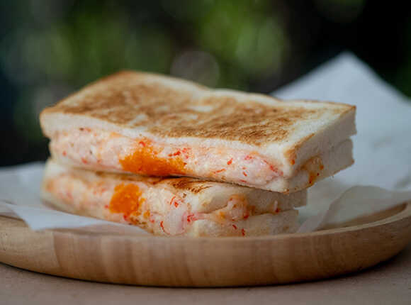 แซนด์วิชปูอัดไข่กุ้ง ขนมปังย่างกรอบนุ่มไส้แน่นรับมื้อเช้า
