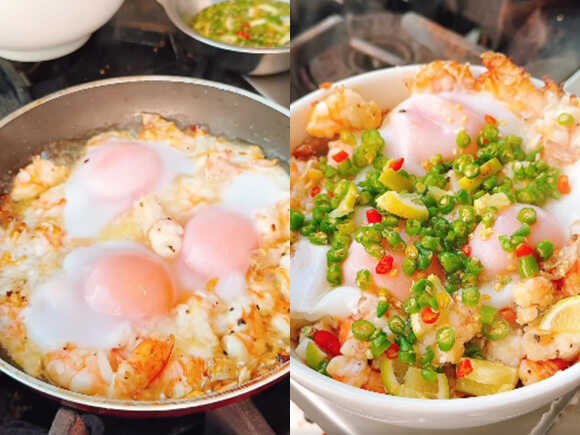 เมื่อนำไข่กับกุ้งเทลงกระทะ เห็นแล้วถึงกับตักข้าวรอกินทันที