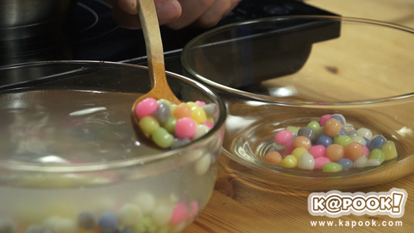 • ตักเม็ดแมงลักโรยลงในถ้วยบัวลอย พร้อมเสิร์ฟ