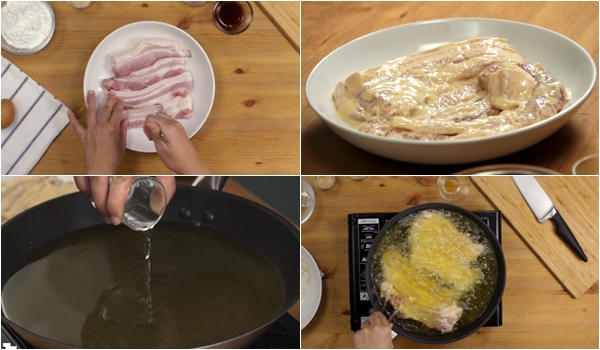 4. เปิดไฟแรง พอน้ำมันร้อนให้นำเนื้อหมูลงทอดทีละด้านจนเปลี่ยนเป็นสีน้ำตาล ตักขึ้นสะเด็ดน้ำมัน
