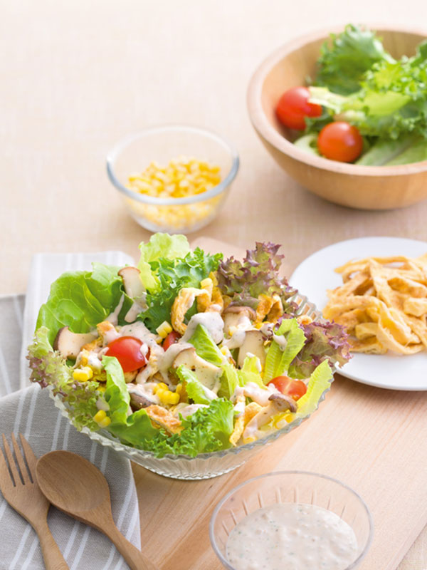 4. จัดผักสลัดต่าง ๆ และไข่เจียวหั่นเส้นใส่ภาชนะ ราดด้วยน้ำสลัด ก่อนเสิร์ฟคลุกเคล้าให้เข้ากันอีกครั้ง