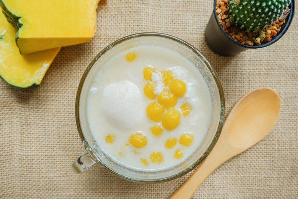 มันออกจะสีเหลือง ๆ หน่อยนะ เพราะเมนูบัวลอยหลากสีถ้วยนี้ทำจากฟักทองนั่นเอง ขอนำเสนอบัวลอยฟักทอง จับแป้งผสมกับเนื้อฟักทองแล้วปั้นเป็นก้อนกลม ราดกะทิใส่เนื้อมะพร้าวเผา