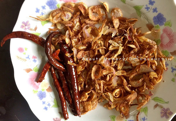 เอาหอมแดงมาซอย เสร็จแล้วเอาทิชชูมาซับ ๆ หน่อยนะคะ เพราะจะมีน้ำออกมา เวลาทอดจะใช้เวลาเยอะค่ะ