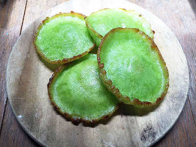 3. ตักแป้งใส่พิมพ์ความหนาบางตามชอบ โรยถั่วลงไปพอทั่ว นำพิมพ์ลงทอดในน้ำมันที่ร้อน ใช้ไฟกลางค่อนไปทางอ่อน พอแป้งสุกจะลอยตัวหลุดพิมพ์ออกมาเอง ถ้ายังไม่หลุดก็ให้ช้อนหรือใช้ไม้ปลายแหลมช่วยแงะออก ทำจนแป้งหมด