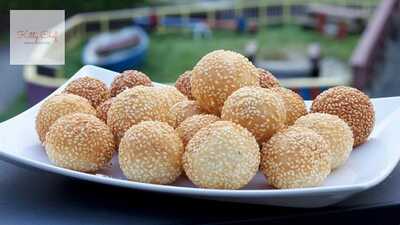 4. ใส่น้ำมันพืชลงในกระทะขนาดเล็กสูงประมาณ 1/2 ของกระทะ นำขึ้นตั้งไฟอ่อน ๆ พอน้ำมันร้อน กวนแป้งให้เข้ากันแล้วตักหยอดลงตรงกลางกระทะ (ระวังอย่าให้แป้งใต้กระบวยหยดลงในกระทะ) ขนมจะค่อย ๆ พองจากด้านนอกเข้าสู่ด้านในจนปิดสนิท รอจนขนมเหลืองและลอยขึ้นจากน้ำมันแล้วพลิกกลับด้าน จากนั้นตักน้ำมันราดตรงกลางของขนมเพื่อให้ตรงกลางขนมปูดขึ้น ตักขึ้นสะเด็ดน้ำมัน พร้อมเสิร์ฟ