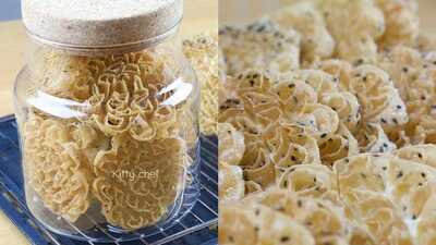 5. นำพิมพ์ชุบแป้งเสร็จแล้วลงไปทอดในน้ำมันที่ร้อน ใช้ไฟกลาง พอเอาพิมพ์จุ่มลงในน้ำมันแล้วค่อย ๆ เขย่าพิมพ์ แป้งก็จะหลุดออกจากพิมพ์ ทอดให้สุกเหลือง เอาขึ้นพักให้สะเด็ดน้ำมัน พอพักจนเย็นก็กินได้แล้ว