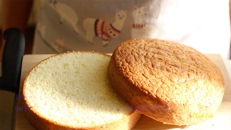 ► เทแป้งที่ผสมแล้วใส่ลงในพิมพ์เค้กที่เตรียมไว้ หลังจากนั้นใช้ไม้ขนาดเล็กคนแป้งเป็นวงกลม และกระแทกพิมพ์เค้กกับโต๊ะประมาณ 3-4 ครั้ง เพื่อไล่ฟองอากาศในแป้งเค้ก