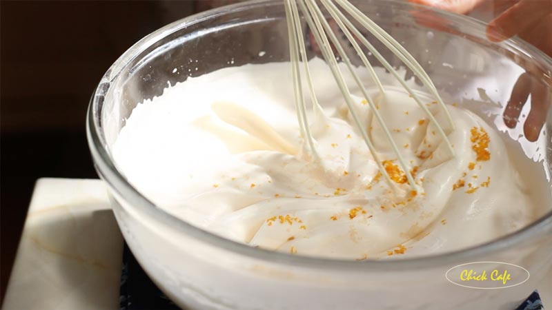 ► นำผิวส้มที่ขูดไว้ใส่ผสมกับส่วนผสมไข่ คนผสมให้เข้ากันอย่างเบามือ