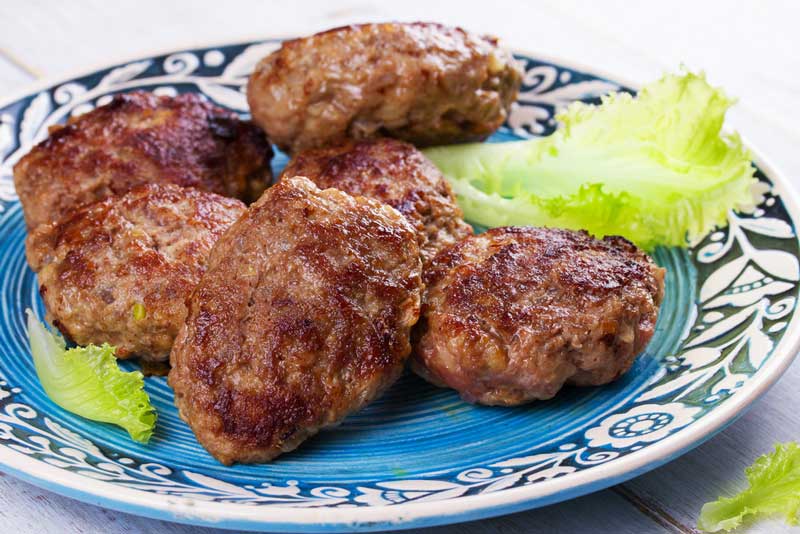 3. ตั้งกระทะใส่น้ำมันลงไป พอน้ำมันร้อนปั้นเนื้อสับเป็นก้อนกลมแบน ใส่ลงไปทอดจนสุกทั้งสองด้าน ตักใส่จาน