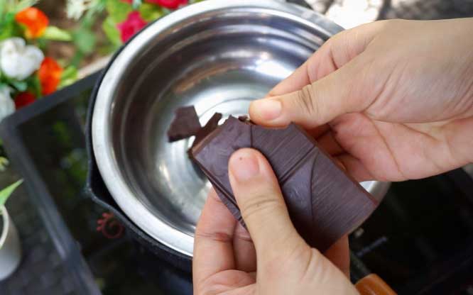เมื่อช็อกโกแลตละลายแล้วใส่ผงโกโก้ คนให้เข้ากัน รอให้คลายความร้อนสักพัก