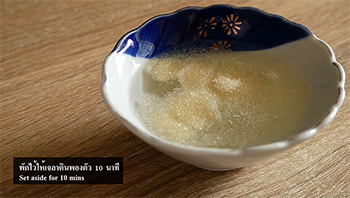 - เทน้ำเย็นใส่เจลาตินแล้วตั้งทิ้งไว้ประมาณ 10-15 นาทีค่ะ
