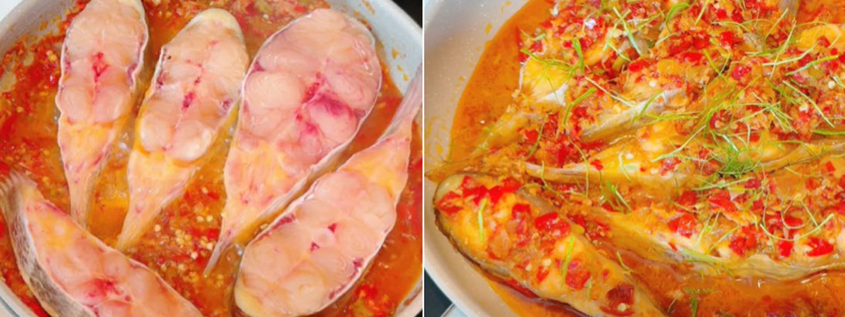 พอปลาสุกแล้วให้กลับปลาอีกด้านหนึ่ง รอจนปลาสุกทั่วทั้งชิ้น ชิมรสชาติ ปรุงรสตามชอบ