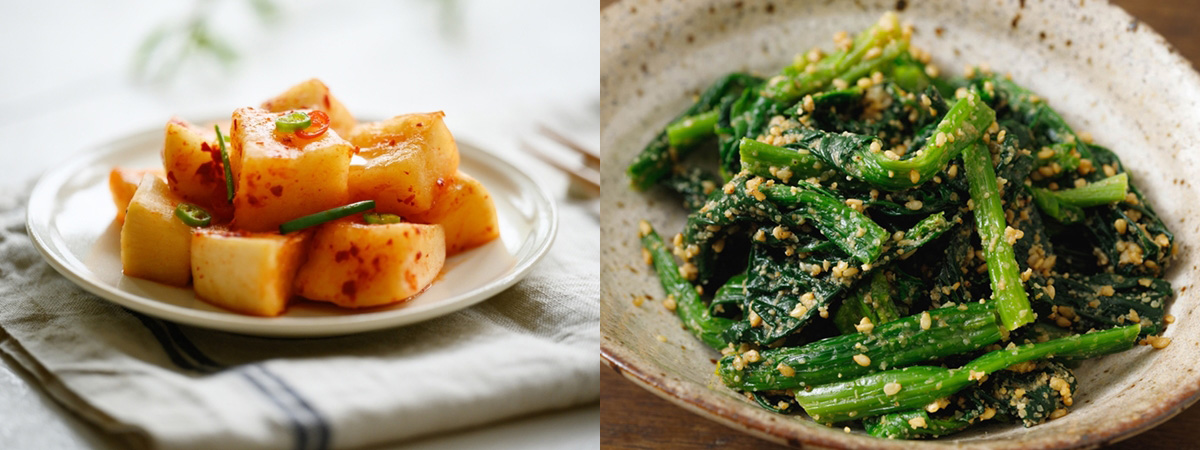 - นามุล (나물) - ประเภทคลุกปรุงรส เป็นการนำผักไปผัด ลวก หรือนึ่งก่อน แล้วนำมาคลุกเคล้ากับเครื่องปรุงรส อย่างน้ำมันงา, โชยุ (ซอสถั่วเหลือง) หรือกระเทียมสับ รสชาติมักจะเค็ม ๆ มัน ๆ กลมกล่อม