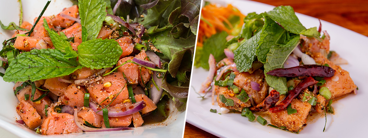 จัดเสิร์ฟในจานที่รองด้วยผักกาดหอม โรยใบสะระแหน่และพริกทอด เพิ่มความน่ากิน