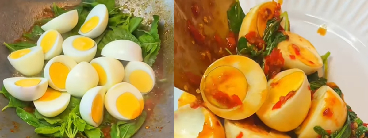 อินสตาแกรม @chrachdaasmayyaa ได้เผยภาพแม่บ้านสาธิตการทำเมนูผัดกะเพรา โดยเปลี่ยนจากเนื้อสัตว์เป็นไข่ต้ม เริ่มจากต้มไข่ให้สุกกำลังดี จากนั้นให้ใส่พริกและซอสหอยนางรมผัดให้เข้ากัน ปรุงรสชาติให้นัวขึ้น แล้วนำใบกะเพรา ตามด้วยไข่ต้มลงกระทะ ผสมให้เข้ากันจนเป็นกะเพราไข่ต้ม เห็นแล้วถึงกับอยากตักข้าวกินเลยทีเดียว